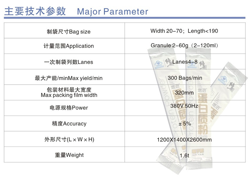 DXDF320 stick packing machine for powder takes the international advanced screw propelling type of feeding. Mainly to the filling of powder, it is running fast, highly precision measurement and easy to adjust.